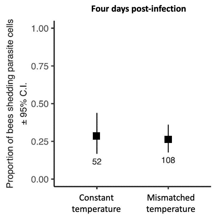We compared temperature treatments and infection over time to analyze our results. Figure 1 shows the number of bees that had parasite cells in their feces 4 days after they were infected. On day 4, there was no difference between bees that were kept at constant or mismatched temperatures.