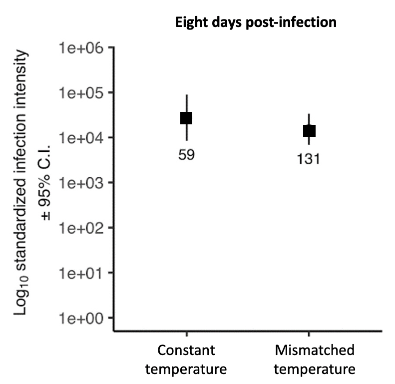 Figure 3 shows the intensity of the infection 8 days after the bees were infected. There was no difference between bees that were kept at a constant temperature and those that experienced a mismatched temperature.