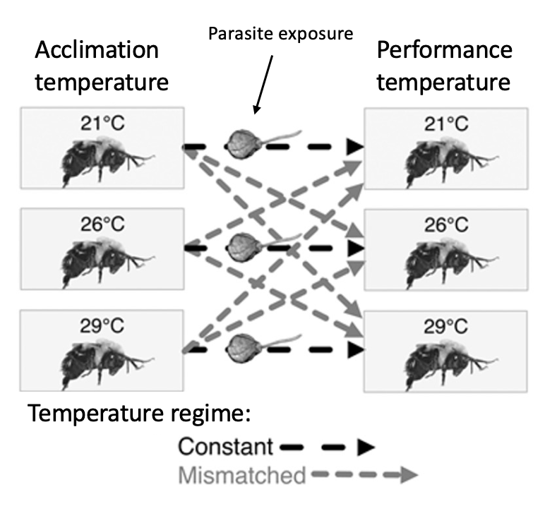 In our experiment, we used bees from four different colonies. Each bee was given one week to acclimate, or get used to, a specific temperature. They were acclimated to 21°C, to room temperature (between 25-26°C), or to 29°C. Next, we gave each bee one of two strains of the parasite, C. bombi. This parasite is commonly found in the gut of the bumble bee. We gave the bees the parasite by mixing C. bombi into sugar water that was fed to them. After parasite exposure, bees were then put in a performance temperature of 21°C, room temperature (between 25-26°C), or 29°C. This means that some bees went back to the temperature that they were acclimated to, but others were placed into a different, mismatched, temperature. At four and six days after parasite exposure, we checked to see if the bees were infected by collecting their feces and looking for parasite cells inside. Eight days after parasite exposure, we froze the bees and measured how intense the infection was.