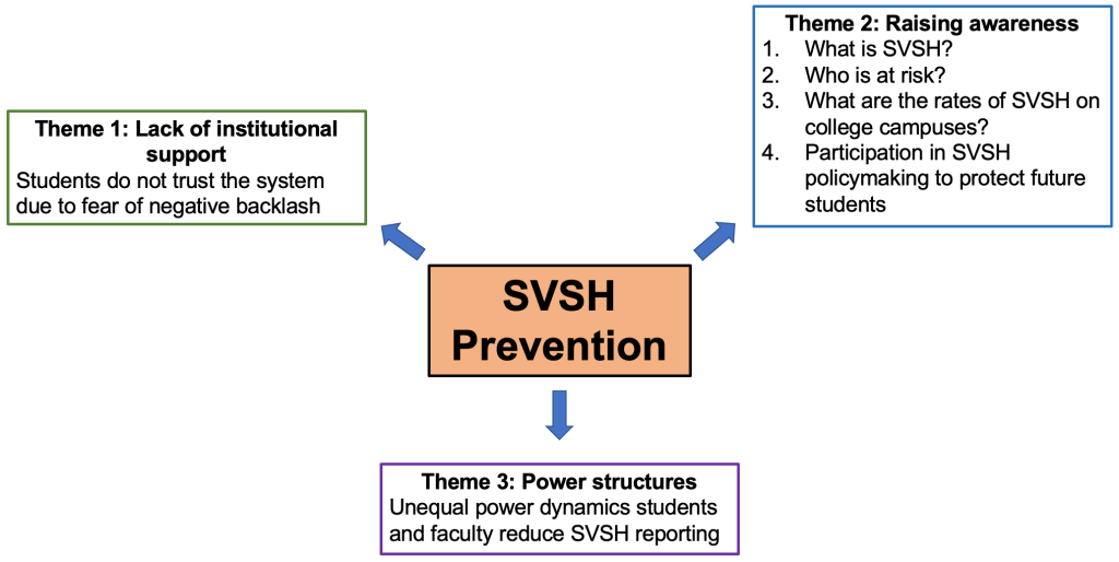 Highlights: SVSH is a continuing problem on college and university campuses. Students in disciplines that historically lack diverse faculty are at a higher risk of SVSH. Until recently, most research on SVSH has focused on students that identify as white. These studies have also not been intersectional, where students have more than one identity. Our study highlights the importance of race and ethnicity in SVSH work. The stories that we heard from students emphasize that SVSH work is also diversity work. SVSH needs to be more culturally informed because students from underrepresented backgrounds are more likely to experience SVSH. The same is true for sexual orientation. People who identify as gay or lesbian are more likely to experience SVSH than those who identify as heterosexual. Transgender individuals and bisexual individuals are the most likely to experience sexual violence. The students who participated in our study were able to share unique experiences that spoke to these issues. One Latinx student spoke about some of her cultural norms which involve greeting people by kissing. She explained that she was uncomfortable when Latinx faculty engaged in that behavior in academic settings but wasn’t sure about how to respond when it took place. Understanding that certain behaviors have a cultural context is important for teaching and learning consent. We need to recognize and respect the unique experiences of all people in our academic communities and support survivors to prevent SVSH.
