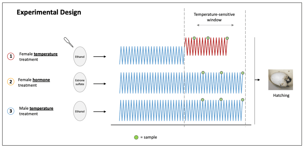 Highlights: For this research, we placed turtle eggs in a temperature-programmed incubator to mimic the temperature that turtle eggs experience in nature. In the wild, temperatures go up during the day and down at night, so we programmed our incubator to do the same. Our goal was to understand how genes respond to these temperature changes. We started with three experimental treatments. In the first treatment, we initially incubated eggs using cool temperatures, then shifted the eggs to warm temperatures during the window of development that turtles are most sensitive to temperature. This treatment was designed to create females. In the second treatment, we incubated the eggs using cool temperatures and added our hormone, estrone sulfate, to the eggs to create females. In the third treatment, we incubated eggs using only cool temperatures to create males. The full experimental design is pictured below in Figure 1.